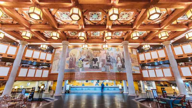 层挑高的大堂,雄壮大气,高处绘制的壁画明明白白地告诉我们,这里是敦煌。
